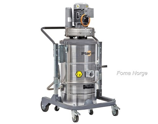 ATEX Støvsuger for oppsamling av brennbart materiale med sikkerhetsgrad IP65 for jobbing i ATEX-sone 22. Maskinen har eksplosjonssikker turbin og er utformet slik at hver komponent er jordet.